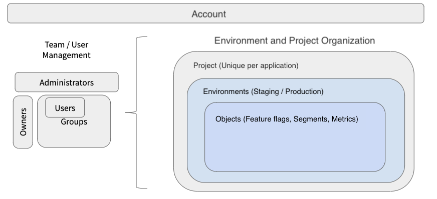 Below is an overview of the default structure of users, environments, projects, and objects within your Split account. From here, you can organize and customize how you would like to structure