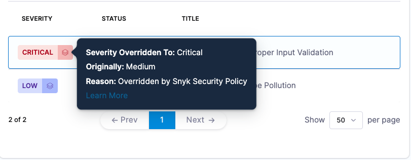 - Updated severity override logic in the Vulnerabilities tab to correctly reflect changes. For example, when a severity is overridden from medium to low by Snyk, the UI now displays the correct direction of the override (STO-9483).