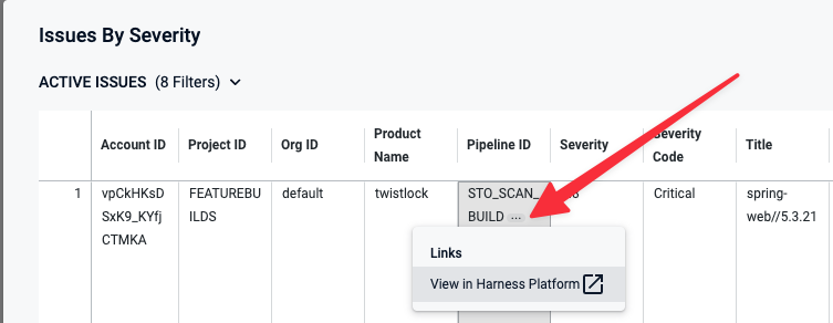 To view details for an issue from the search results, click the pipeline name or ID and choose View in Harness Platform.
